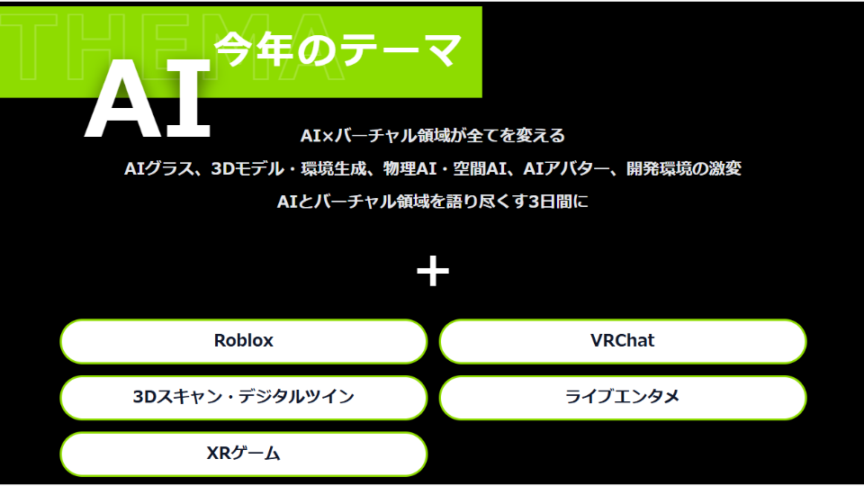 2025年は初めてメインテーマに「AI」を設定しました。さらに「Roblox」「VR Chat」「3Dスキャン・デジタルツイン」「ライブエンタメ」「XRゲーム」を加え、計6つのテーマを通じてバーチャル領域と関連分野の最新動向を紹介します。